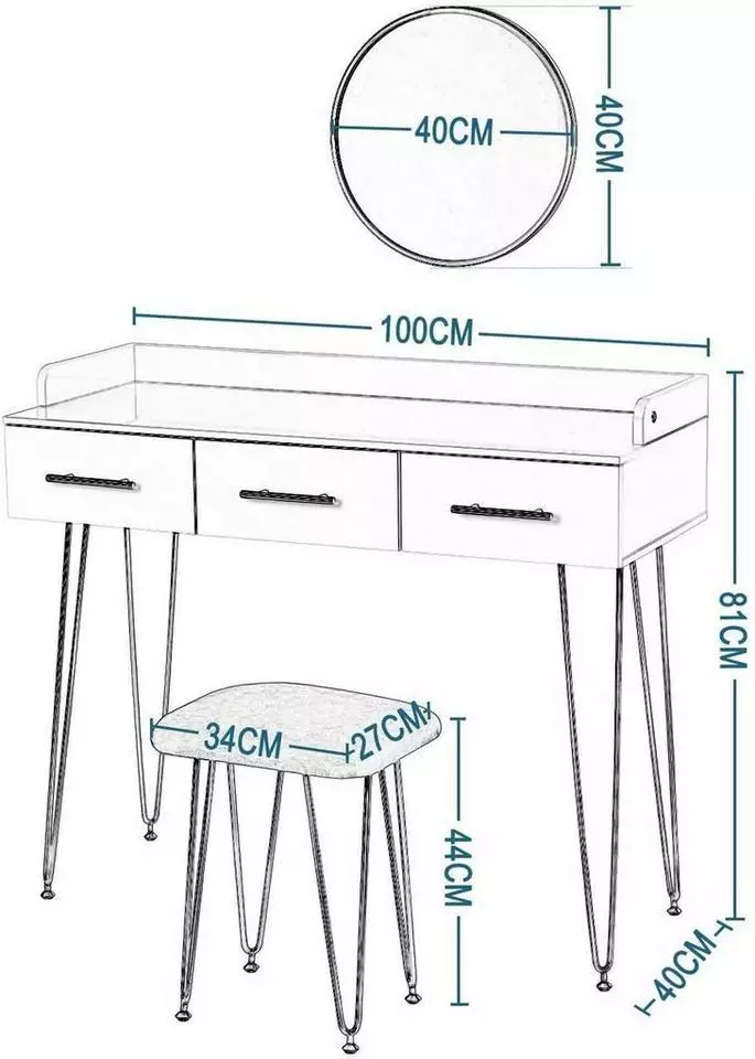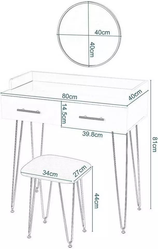 - Die Tischplatte mit der Größe von 80 x 40 cm (B x T) bietet viel Platz fürs tägliche Schminken und Frisieren. Man kann den Tisch praktisch als Schreibtisch fürs Home-Office oder zum Studium verwenden.