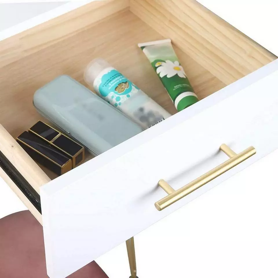 - Die glatte Oberfläche der Tischplatte und der Schubladen sind wasserabweisend und schimmelresistent. Die Beine mit goldene Beschichtung sind rostfrei, robust und haltbar. Zudem sorgen sie für eine schöne Optik.
