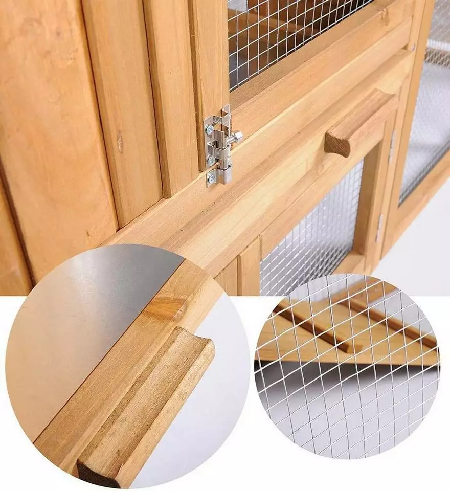 - Verzinkter Draht: Der verzinkte Draht wird sorgfältig im Holzrahmen des Hasenkäfigs verbaut, um Ihren Nager vor scharfen Kanten zu schützen.