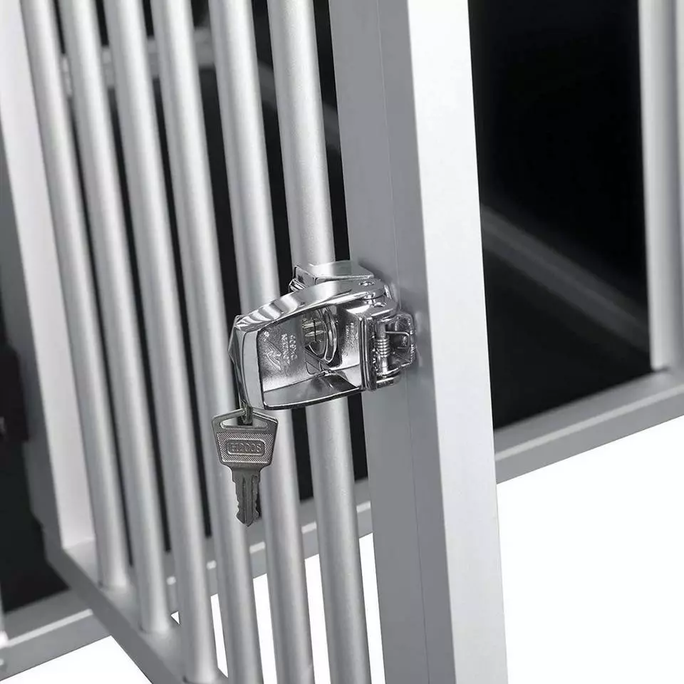- Sicherheitsverschluss: Es gibt ein einfaches Schloss an der Tür. Man kann das Schloss mit einer Hand öffnen. Der an der Tür angebrachte Sicherheitsverschluss kann verhindern, dass sich die Tür automatisch öffnet, und sich der Hund von selbst öffnet.