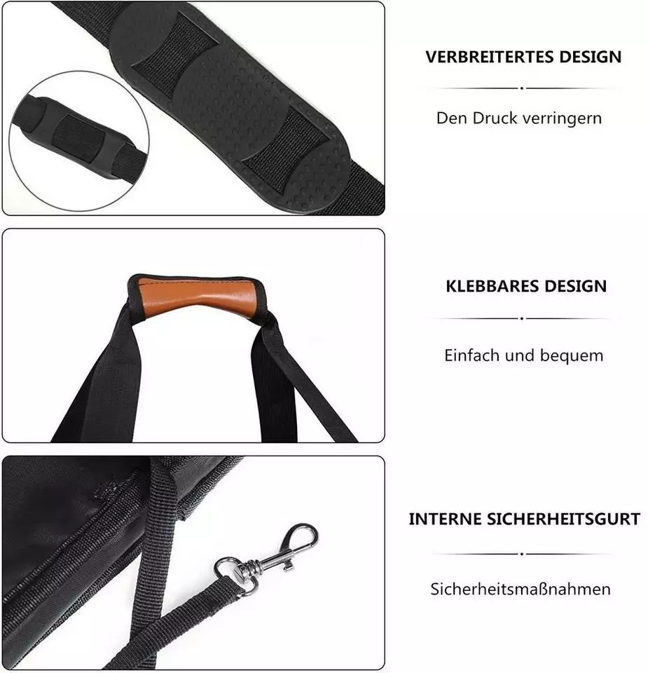 - Der verstellbare Schultergurt hat verbreiterte und verdickte Schulterpolster, um den Druck auf die Schulter zu verringern und das Tragen von Haustieren zu erleichtern.