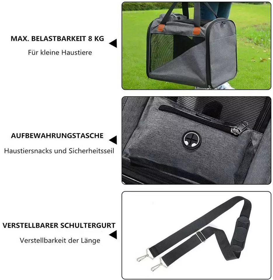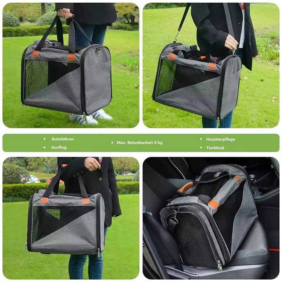 - Um die Reisesicherheit zu versprechen und ein Entweichen und Herausspringen von Haustieren zu verhindern, wird empfohlen, Halsbänder oder Hundegeschirre für Haustiere zu tragen und mit dem Sicherheitsgurt in der Tasche zu verbinden.
